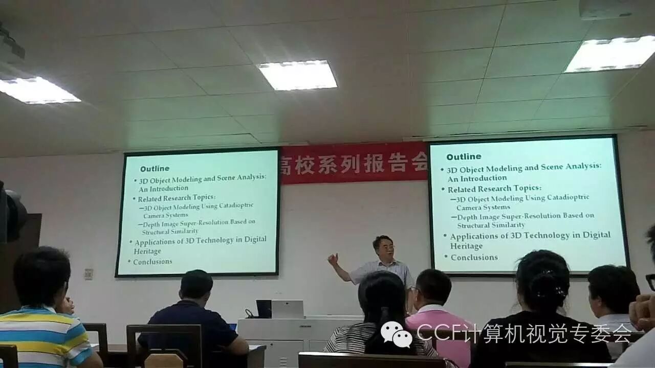 查红彬教授的报告题目为“3D Reconstruction for Object Modeling and Scene Analysis”。他首先给在场同学带来了三维物体重建与场景分析的Introduction。就相关研究话题分析了物理网络系统(CPS)中的存在问题,介绍其研究组使用catadioptric相机系统进行三维建模的研究,详细阐述了使用两面镜系统简化相机标定过程的方法及原理。查教授分析了当前各类采集三维数据的传感器存在的问题,引入其团队在深度图像分辨率提高方面的创新性工作。最后用几个非常有趣应用向听众展示了该研究在实际问题中的应用价值。