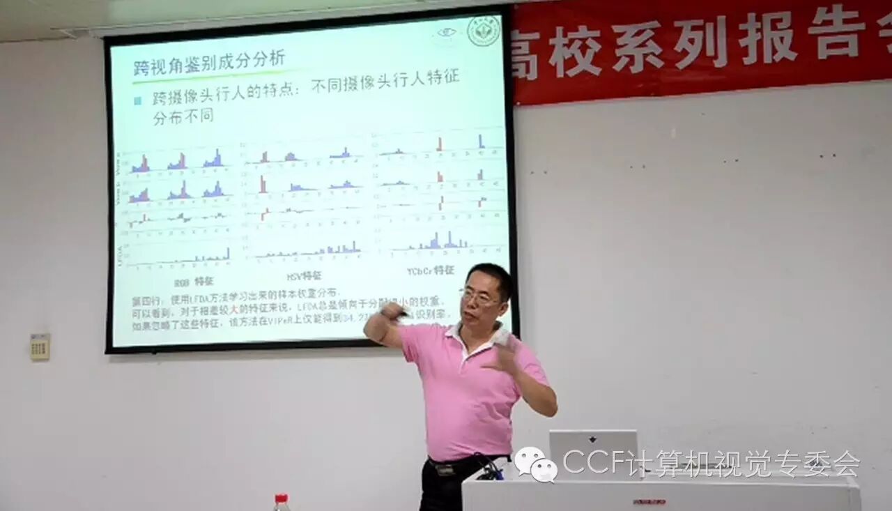 赖剑煌教授以“行人再标识问题的若干研究进展”为题详细介绍了他们团队在该领域非常深入的工作。首先给出行人再识别问题定义和该问题的挑战性,然后报告归纳了两类方法:摄像机之间有重叠视域及摄像机间具有非重叠视域。后者是当前研究的主流,该类方法常见的有基于行人特征表达的方法、训练行人匹配模型的方法、上下文线索的挖掘、基于迁移学习的跨场景行人再标识。最后,赖教授重点讲解了其团队在行人再标识领域的陆续提出的6个方法:基于行人特征表达的方法;基于深度排序和联合表达的行人再标识;基于不对称激励学习的行人再标识;基于部分匹配的行人再标识;基于深度信息的行人再标识;现实场景中基于去身份混淆的行人再标识。每种方法都图文并茂地展示了计算过程和详细的实验结果对比。