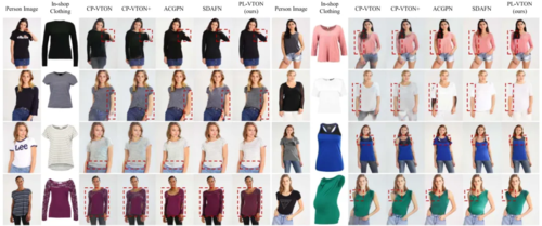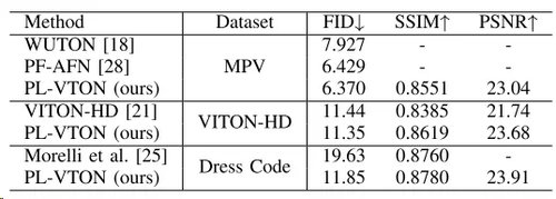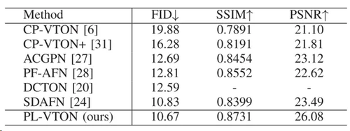 最后,表1、表2分别展示了各方法在不同数据集上的定量结果对比,可以看出,相比于现有方法,PL-VTON 在各个数据集上均取得了更好的指标。