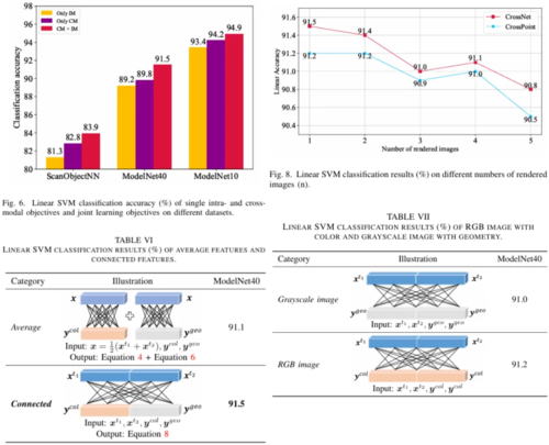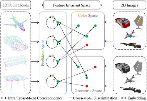 跨模态对应学习。除了点云的模态内对应关系,我们还旨在引入点云和图像之间的跨模态对应关系来学习判别特征,从而使不具有颜色和几何特征的点云能够表现出更好的学习能力。我们试图通过连接特征而不是平均特征的方式来研究跨模态对应关系,选择这样做的原因如下:1)在没有任何先验知识处理的情况下直接平均特征可能会削弱其在高维特征空间中的泛化能力,并且容易出现冗余;2)由于颜色和几何图像特征不共享权重,因此在将连接输入损失学习网络后,更容易捕获点云和图像之间的更多潜在联系。