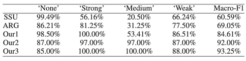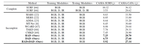 表1与当前最优方法在CASIA-SURF和CEFA-SURF数据集上的活体检测任务对比结果