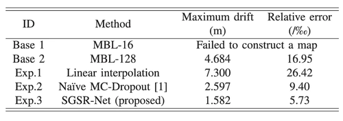 SGSR-Net使用配备多个多线束激光雷达的UGV收集的数据集进行验证。结果表明,与SOTA方法相比,所提出的CGLSR(CASE Attention Guided Encoder-Decoder LiDAR Super-Resolution Network)点云超分辨率网络,将超分辨率点的MAE降低了12.4%,降至0.177m。SGSR-Net生成的超分辨率点的室内SLAM结果表明,绝对位姿误差(APE)的均值和RMSE分别下降了27%和30%,分别降至0.849m和0.902m,这显着改善了LiDAR-SLAM系统的室内SLAM性能和稳定性(即LeGO-LOAM)。SGSR-Net按照雷达扫描线排列生成超分辨率点,并保留由传感器生成的原始深度图像定义的空间分区。SGSR-Net与SLAM算法无关,可以作为激光雷达点输入插入任何LiDAR里程计/SLAM系统(例如LOAM、LeGO-LOAM、CT-ICP)。