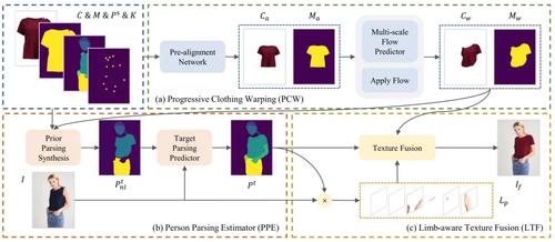 本文提出的方法共由三个子模块组成:渐进式服装形变(PCW)、人体解析估计(PPE)以及肢体感知纹理融合(LTF)。