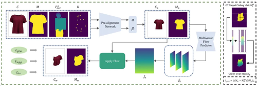 渐进式服装形变(PCW):PCW模块采用两阶段对齐策略,首先通过预对齐网络对目标服装的位置和尺寸进行显式建模,然后使用多尺度流估计器来预测目标服装的像素级几何形变。在此过程中,为了更贴近人体穿衣的真实情况,我们还引入了一种重力感知损失,通过构建一个基于位置的渐变掩膜,调整形变网络对服装不同区域的监督权重,从而更好地处理衣服边缘并使形变结果更加真实。