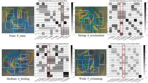 图3个体动作与群体活动关系可视化。每个例子左边的鱼类图片为输入帧,具有鱼类个体真实标记框和鱼类群组活动标签;右边为12个鱼类个体动作之间的关系图。横坐标为对应编号和真实动作标签,纵坐标为输入帧的鱼类个体编号;红色矩形框为该输入帧某个动作的行之和最大值,代表着关键的动作行为