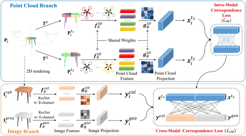 图2 CrossNet框架。它由两个分支组成,即:点云分支,通过选择给定点云的两个随机角度,然后增强所施加的不变性,来评估点云模态内的对应性;图像分支,通过在连接的点云原型特征和渲染的图像原型特征之间引入对比损失来形成跨模态对应。