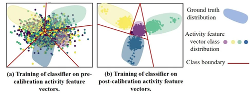 图1分类器在活动特征向量校准前后的比较。(a)表明活动特征向量类的分布是混乱且粘连在一起的(本文中称为“基础数据”)。分类器很难从基础数据中得出准确的边界。此外,类边界内的活动特征向量数据的分布与真实分布不匹配。(b)显示了分类器在校准后活动特征向量上的训练。与(a)相比,分类器可以准确地划分不同活动特征向量类之间的边界。在类边界区域内,没有其他类别标签点,符合真实的分布范围。