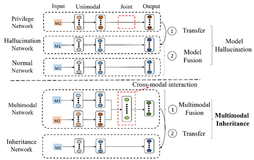 近些年,多模态学习技术因其卓越的性能和鲁棒性受到了越来越多的关注,并在多个领域取得了显著成果,如医疗图像分析、动作识别和面部反欺诈。已有的多模态方法大都假设所有的训练数据在训练和测试阶段是可获取。然而,实际应用场景中,由于设备限制或用户隐私等因素,在模型推理阶段可能很难获取完整的多模态信息。因此,如何利用仅在训练阶段获取的特权模态(privileged modality)信息来辅助多模态模型的优化成了多模态学习领域的重要挑战。当前的方法主要关注训练一个幻觉网络(Hallucination network)从可用模态中恢复特权模态信息,然后进行信息的后融合 (图1 上)。这类方法简单有效,但是忽略了模态间丰富的跨模态交互信息,同时,这些方法也并没有利用好已有的基于完整数据训练的多模态模型,带来了算力资源的浪费。