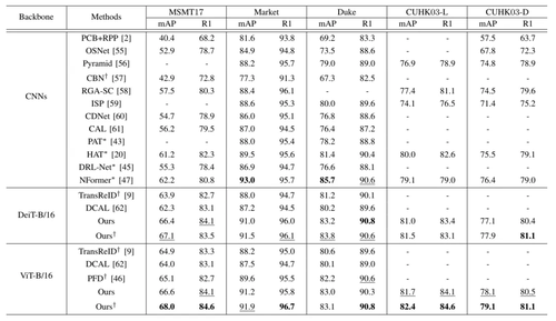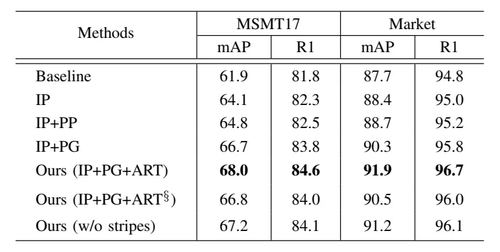 本文将所提出的方法在MSMT17,Market1501,DukeMTMC-reID和CUHK03四个行人再识别数据集进行了实验,验证了提出方法的有效性。表1是消融实验,表2是与SOTA方法的对比实验。图4表示ART模块生成的部件掩码的可视化结果。