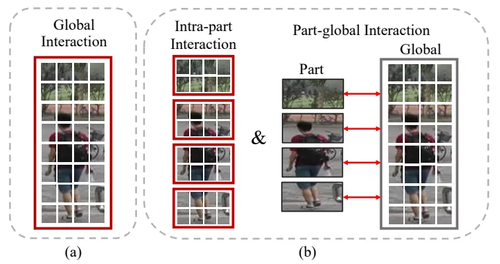 图1 (a) 从整个行人图像中获得令牌,并构建全局交互;(b) 从行人图像的条纹部件生成令牌,并构建部件内交互和部件-全局交互,以学习完备的部件交互。红色方框和红色双向箭头分别表示使用自注意力和交叉注意力学习交互。
