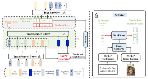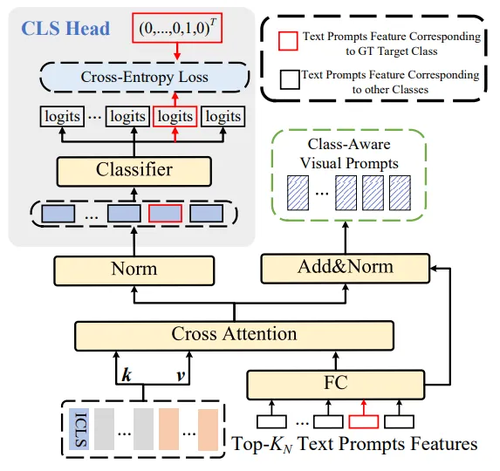 为了促进模型进一步关注到任务特定的信息,我们引入了CAVPT,如图3所示,CAVPT生成器以不同类别文本特征为query,通过与视觉特征图进行交叉注意力计算,编码类别感知的特定区域视觉信息并注入视觉提示,为了获得更具区分度的类别特定的视觉表征,我们对交叉注意力获得的视觉信息进行了分类。CAVPT进一步提高了模型对任务相关的视觉信息的感知。此外,我们对作为query的文本特征进行了Top-K筛选,有效的减少了计算开销。