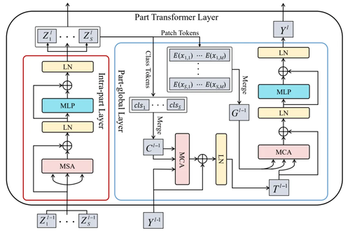 本文提出方法的整体框架如图2所示。首先,将每个行人图像分割成几个条纹,然后将它们输入到L个Part Transformer Layer中,Part Transformer Layer的结构如图3所示。其中,每个Part Transformer Layer由一个Intra-part Layer和一个Part-global Layer组成。Intra-part Layer学习部件内交互,它表示每个条纹部件内令牌之间的交互,即挖掘行人图像条纹部件内部的长距离依赖关系。Part-global Layer学习部件-全局交互,它有助于学习完备的部件交互,表示每个条纹部件与整个行人图像中所有令牌之间的交互。其中,每个条纹用一个特征向量表示,条纹部件与整个行人图像中所有令牌的交互通过交叉注意机制实现,从而能够聚合每个条纹部件的全局信息。