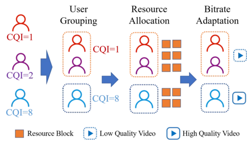 论文提出了一种基于k-means聚类和合作讨价还价博弈的自适应视频组播解决方案(KGS)。如图1所示,我们提出的视频组播由用户分组、资源分配与码率决策三个相互影响的部分组成,我们将视频传输问题描述为一个联合优化问题,然后对该问题进行解耦,设计了一种基于启发式方法的解决方法。
