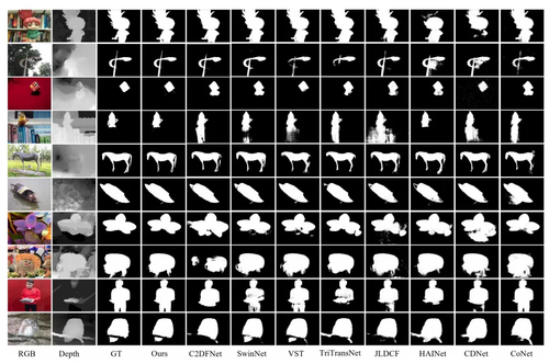 为了进一步验证CATNet的有效性,图2展示了一些定性可视化结果。可以观察到,在许多具有挑战性的场景下,CATNet比其他模型生成了更精确的显著性图,这表明CATNet更具竞争力。例如:边缘和细节(第1−第2行)、小的对象(第3−第4行)、低质量的深度图(第5−第6行)、复杂的背景(第7−第8行)和大的对象(第9−第10行)。