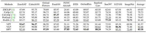 本方法在11个下游数据集上进行了实验,图4展示了本方法在ViT-B/32与ViT-B/16两种视觉编码器上不同shot数下的平均精度,表1与表2分别展示了本方法在ViT-B/32与ViT-B/16两种视觉编码器上16shot情况下与其他先进方法的结果对比。可⻅我们的双模态提⽰策略相较于单模态提⽰有了提升。⽽在CAVPT的辅助下,DPT相较于VLP取得了进一步提升。