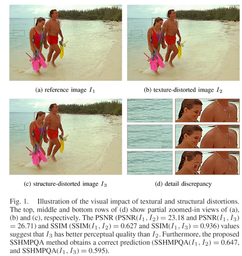 图像是由结构化的对象和覆盖物体表面的纹理所组成的,它们对HVS来说具有完全不同的视觉效果,一个性能优异的IQA方法应该充分考虑图像结构的视觉显著性效应和图像纹理的遮蔽效应。结构是描述图像内容的关键基础,因为结构传达了图像中呈现的基本信息,使人们能够理解图像的语义。人们在观看一幅图像时,首先会自然而然地感知到它的结构,并理解这个结构中的物体,而不是检查详细的局部纹理。因此,HVS对图像中的结构失真极为敏感。纹理是一种反映了图像中的同质现象的视觉特征,它包括了物体表面有规律和周期性变化的像素排列。由于视觉遮蔽效应,HVS对一些纹理失真并不敏感,这意味着失真图像中的纹理区域不一定要与参考图像在每个对应像素上完全相同。