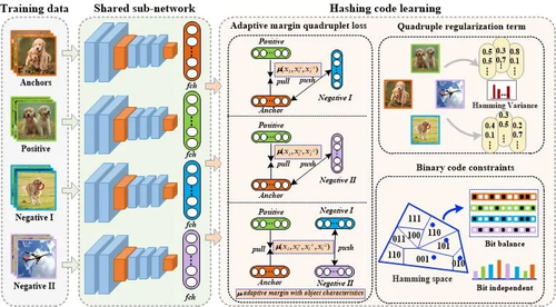 通过引入区分性原始特征计算样本对之间的相似性阈值,本文提出了一种基于近邻结构保持的深度哈希学习框架来产生具有区分性的哈希编码。具体的深度哈希学习框架如图2所示,总体包括三个部分:(1)通过提取区分性的目标特征来计算样本对之间的相似性阈值,本文设计了一种基于自适应阈值的四元组排序损失来保持原始空间的潜在近邻结构,保证学习到的哈希编码具有良好的类内聚敛性和类间分离性。(2)基于四元组损失优化,本文采用了一种四元组正则化约束来减少哈希学习中的量化误差。(3)通过联合学习哈希位的平衡性和独立性,本文设计了一种离散化约束损失来减少不同哈希位之间的信息 冗余,提升所学习到的哈希编码的区分性。