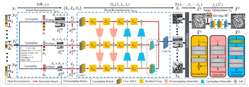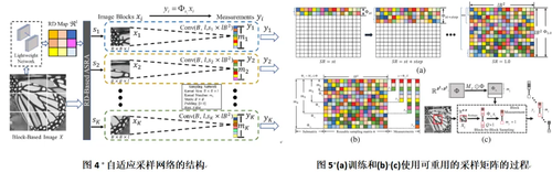 图3展示了RACSNet的框架,其由三个模块组成:自适应采样模块(图4)、重建网络模块(图6)和图像优化模块。自适应采样模块对不同图像块自适应的分配采样率;重建网络模块对采样后的测量值进行初始重建和深度重建;图像优化模块则用于消除块效应并提升图像质量。具体而言,首先使用基于测量域的重建失真来指导不同图像块的采样率分配,该方法只利用测量值而不需要获取原始图像。然后,设计了一种逐步训练策略来训练可重复使用的采样矩阵(图5),使其能够在任意采样率下对图像块进行采样生成压缩的测量值。随后,提出了一种金字塔形的初始重建子网络和分层深度重建子网络,用于从压缩测量值中重建图像块。最后,利用重建失真图和改进的损失函数来消除块效应并进一步增强重建质量。