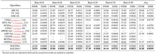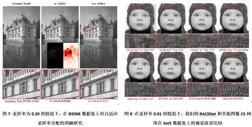 为了验证RACSNet的性能,本文与12个CS算法进行了对比,包括基于优化的算法、基于深度网络的非自适应CS算法和自适应CS算法。实验结果表明,RACSNet在客观指标(表1)和主观视觉质量(图8)方面都显著优于现有的自适应和非自适应CS方法,并为自适应采样率分配提供了一种新的解决方案。此外,我们也对自适应采样进行了消融实验(图7),可以看出自适应采样策略将更加关注图像的细节,从而在视觉效果方面实现更精细的重建。