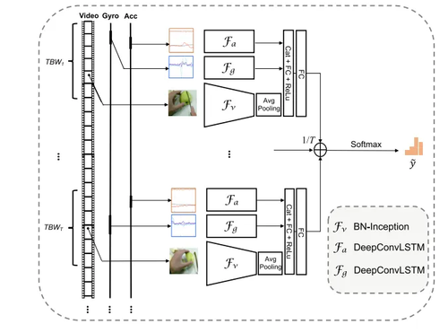 多模态行为识别模型:图2是面向视频图像、加速度计序列、陀螺仪序列的多模态行为识别模型。来自多个时间采样片段的多模态信息使用时间滑动窗(Temporal Binding Network,TBN)进行随机组合得到一个窗口的输入数据。其中视频帧提取器使用BN-Inception进行视觉特征提取,预处理后的加速度计和陀螺仪传感序列使用DeepConvLSTM进行运动信息特征提取。模型先将每一个窗口得到的多模态特征进行融合得到每一个窗口的预测结果,随后将各个时间窗口的预测结果取平均进行综合。