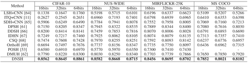 表1 CIFAR-10、NUS-WIDE、MIRFLICKR-25K以及 MS COCO数据集上基于16-bits、32bits和64bits的mAP结果