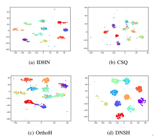 为了验证本文所提方法的有效性,分别在CIFAR-10、NUS-WIDE、MIRFLICKR-25K以及 MS COCO四个公开数据集上与多个主流的传统哈希/深度哈希进行了对比实验,具体实验结果如下所示。表1中展现了四个公开数据集上基于16-bits、32bits和64bits的mAP结果。此外,在CIFAR-10上,我们还绘制了128位哈希编码的t-SNE结果图,具体结果如图3所示。