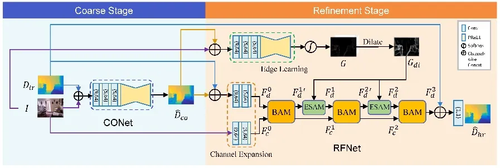 该阶段中的CONet负责进行低分辨率深度图的预处理,通过所提出的粗糙监督策略(Coarse Supervision Strategy),使CONet对输入的低分辨率深度图进行初步的去噪和超分辨率处理,减轻深度图中的噪声和模糊等退化,并输出粗糙的超分辨率深度图,提高网络应对大倍率超分辨率的能力。