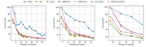 本文构建了面向第一人称视角的持续行为识别数据集UESTC-MMEA-CL。其包含了32个开放环境下的日常行为类别,共计超过30小时的行为实例片段,是当前面向开放场景规模最大的第一人称行为识别数据集。如图1所示,其中每一个行为实例片段包括时间上同步的第一视角视频、加速度计和陀螺仪时序传感序列。与其它面向第一人称视角的行为识别数据集不同,UESTC-MMEA-CL专为研究面向第一人称行为识别的连续学习任务而建立,包含充足的日常行为类别与类平衡的可训练行为数据,支持多种增量任务的划分。