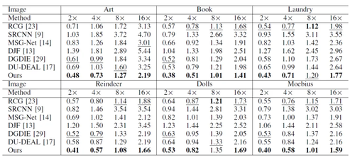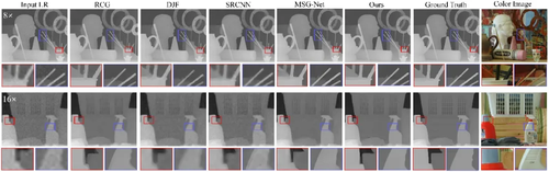 本文在RGB-D-D、NYU Depth v2和Middlebury Stereo数据集上与目前的先进方法进行了对比实验(2×、4×、8×、16×)。实验结果表明,所提方法可以抑制纹理复制现象并恢复准确的边缘结构,在定量和定性评估中均取得了优秀的效果。本文在有噪声Middlebury数据集上实验结果如表1和图3所示。