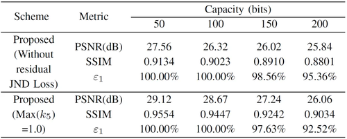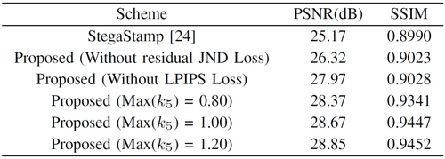 实验通过NSN的噪声模拟效果、含水印图像视觉质量、鲁棒性以及水印嵌入容量几个方面来评估本文方法的性能,图3为一组经由NSN模拟的噪声图像示例图。表1为含水印图像视觉质量(PSNR和SSIM)的比较结果。对于鲁棒性,本文分别在数字环境下和真实环境下进行了比较。图4为一组在数字环境下针对图像缩放和运动模糊的鲁棒性实验结果。表2和表3为真实P-C环境下对于不同拍摄角度和距离的鲁棒性实验结果。表4则分析了不同嵌入容量对模型性能的影响。其中,ε用于评估解码信息的平均准确率,即鲁棒性。