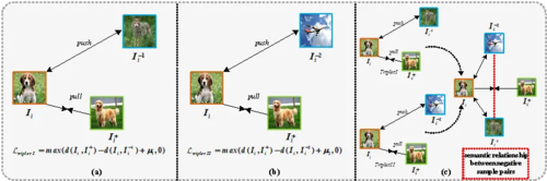 凭借低存储代价和高查询效率的优势,深度哈希学习已经成为了当前大规模图像检索领域的研究热点之一。现有的深度哈希框架通常采用基于pair-wise或者triplet-wise目标函数进行模型优化,并将样本对之间的相似度阈值设置为常量参数。以triplet-wise目标函数为例,所有的三元组样本之间的相似度阈值为固定的。在训练过程中,如果样本对之间的相似性超过了给定的阈值,深度哈希模型将学习不到任何有价值的信息,产生的哈希编码难以保持原始空间的邻居关系。以图1为例,由于Dogs 和 Wolves属于同一物种,图1-(a)中负样本对(Dogs,Wolves)之间相似性阈值应该小于图1-(b)中负样本对(Dogs,Airplanes)之间相似性阈值。然而现有的深度哈希学习策略通常将所有训练样本之间的相似性阈值设置为统一的常量参数,会导致训练过程中的模型崩塌。