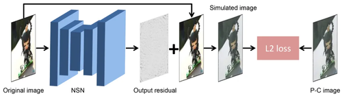 本文提出的端到端框架主要包括四个模块:编码器、鉴别器、失真网络和解码器,见图1。基于U-Net结构的编码器用于将原始图像和水印串联起来生成含水印图像。通过加入对原始图像的下采样反馈,使得编码器对每一层的下采样特征信息学习更加充分并增强原始图像和含水印图像之间的相似度;为了提高含水印图像的生成质量,鉴别器被用来监督编码器的训练并判断其输入的结果是否含有水印;失真网络用于攻击含水印图像,它由数学模型和P-C噪声模拟网络(Noise Simulation Network, NSN)组成。由于数学模型难以完全模拟出真实P-C过程中存在的噪声,因此NSN用于补充被忽略的噪声并减少数学模型带来的过拟合噪声,如图2所示;含有空间变换网络(Spatial Transformer Network, STN)的解码器可在提高对输入图像的几何不变性的同时提取出嵌入的水印。通过使用STN,水印提取层对P-C过程产生的畸变具有更强的鲁棒性。本文提出的基于JND的多任务损失函数可用于降低含水印图像的失真度。具体方法细节可参见论文。