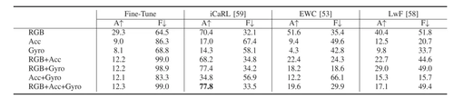 持续行为识别:图3展示了在Finetune条件下进行持续行为识别任务的实验结果。本文发现,在持续行为识别任务上,模型的灾难性遗忘是严重的:其中传感器模态的遗忘情况相比一般视觉模态更加严重,且使用多模态信息进行持续行为识别任务会比仅使用视觉单模态更困难。