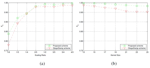 图4 针对图像缩放和运动模糊的鲁棒性比较。(a)图像缩放,(b)运动模糊。