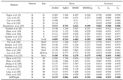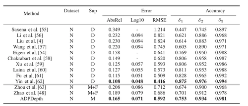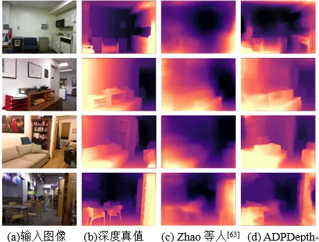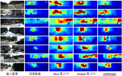 本文同时使用KITTI和NYUv2两种数据集对模型进行深度估计性能评估,表1和表2分别为KITTI和NYUv2数据集上的深度估计对比结果;图4和图5分别为KITTI和NYUv2数据集上的深度估计可视化结果。实验对比结果表明,本方法在物体重建方面表现更好,尤其是在汽车、树木、行人、路灯柱、路障等一些小型物体上生成了更清晰的边界和细节。