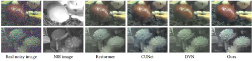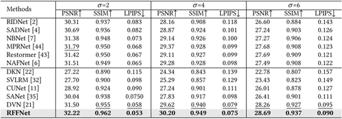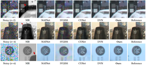 对于近红外引导的低光图像去噪,我们在DVD测试集上评估了RFFNet在高斯-泊松混合噪声条件下的表现。我们将RFFNet与当前最先进的引导图像去噪方法进行了比较,包括DKN、SVLRM、CUNet、SANet和DVN。此外,我们还考虑了单图像去噪方法,如RIDNet、SADNet、NBNet、MPRNet、Restormer和NAFNet。所有比较的方法都是在与我们相同的训练集上训练的。表1显示,我们的方法在三个噪声水平上都取得了最佳结果。