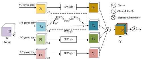 设计PACModule的目的是构建一种有效的注意力机制,克服卷积神经网络在特征提取过程中感受野有限的局限性。如图3所示,采用多分支的策略处理输入特征;利用SEWeight模块获取通道注意力权值,提取不同尺度特征图的通道相关性,将元素级乘积应用于权重和相应的特征映射;对不同尺度上重新加权的特征图进行串联融合;最后,通过利用通道洗牌操作对组进行重新排列,使不同分支之间实现信息交互。