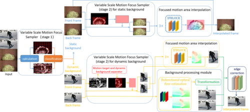 为了准确预测运动叠加下的目标中间状态并节约预测背景的简单线性运动所需的计算资源,本文提出了一种名为MFNet的帧插值网络,该网络专注于运动区域,包括一个用于从背景中高效分离运动区域的采样器、一个用于直接近似中间流的细粒度模块,以及一个用于双向光学流融合的轻量级模块。这个采样器结合了我们所提出的新颖的运动分解算法,能够对复杂的叠加运动进行分解,并抑制光照变化的干扰。随后框架为运动目标与背景采取不同的中间帧预测手段,分别预测出两者中间状态后进行融合,并经过新颖的边缘校正网络优化融合边缘。这样做的好处在于,对复杂运动进行分解后预测能够有效降低伪影出现的概率,并有效节约了背景预测所消耗的计算资源。