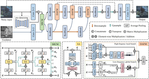 此外,我们提出双域自适应融合模块(DAFM)来充分融合引导图像中不同频率的有效信息,如图2右下所示。为了提取特征的不同频率,一种直接的方法是使用小波变换或傅里叶变换。然而,这些工具难以区分需要增强或抑制的频率成分,并且它们需要额外的计算开销才能将特征转换回空间域。相反,我们使用自适应频率滤波器来产生高/低输入频率。对于高频提取,我们将特征分为几组,并对每组应用不同核尺寸的深度卷积,以模拟不同高通滤波器中的截止频率。对于低频提取,我们使用平均池化作为低通滤波器。我们将上述频率提取应用于噪声特征和引导特征。然后,将高/低频率分别输入到局部和全局分支中,以突出信息信号。
