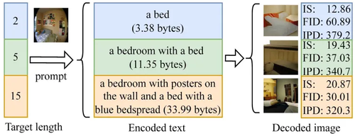 跨模态压缩框架(Cross modal compression,CMC)的目标是将图像编码为一种或多种模态的紧凑表示,并由这些表示重建出与原始图像相似的图像。使用文本作为基础压缩域表示的跨模态压缩具有超高压缩比,利用了人类知识对图像内容进行高度抽象概括,探索了基于知识和多模态大模型的智能编码的潜能,突破了传统编码方法以信号统计特性为基础的限制,拓展了当前图像压缩框架。当前方法难以控制码率,难以满足不同的传输条件、存储介质、应用需求。码率的控制可以通过控制文本长度来获得。实现不同长度文本生成的直接方法是,给定文本长度,模型生成不同长度的文本。近年来,多模态大模型在海量数据训练下学习大量的知识。多模态大模型是一个知识库,是否可以减少微调模型来调用知识库完成任务?因此,专家学者们提出提示学习来实现这个需求。受提示学习启发,本文将生成目标文本长度的文本当成是一种任务,使得多模态大模型生成符合目标长度的文本,从而实现可变码率。本文首先提出基于提示学习的可变码率跨模态图像压缩(VR-CMC)框架,引入可变码率提示方法,并在数据预处理、训练和推理阶段提出相应策略。 如图1所示,根据不同目标长度,压缩模型编码得到不同长度的文本,并用于重构出相应的图像。