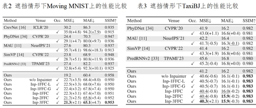本文在基准数据集MovingMNIST、TaxiBJ、Human3.6M、KITTI&Caltech Pedestrian和KTH上开展实验,验证了所提FFINet模型的有效性。表1给出了无遮挡视频预测方法的性能比较, FFINet利用傅里叶变换获取全局时空感受野,让模型能够利用较长时刻前的时空特征表示,大大加强了字符频繁重叠情况下的预测能力,在所有指标上均超过现有方法。表2和表3分别给出遮挡情形下在Moving MNIST和TaxiBJ上的性能比较,可以发现过去方法没有考虑视频中的遮挡情况,在失去遮挡区域的空间特征后,难以提取到足以刻画视频目标的动作模式的时空特征,进而导致预测结果模糊,而FFINet能够利用全局时空特征先对遮挡部分进行还原,再依据还原后的时空特征对后续视频帧进行预测,不仅在无遮挡情况下性能超过所有方法,在数据集存在遮挡情况下三个指标的降幅最小。图3展示了FFINet和主流方法在Moving MNIST数据集上有无遮挡两种情形下的定性结果,上部分无遮挡时的大部分输入视频帧中字符“4”和“8”之间存在大面积重叠情况,FFINet能预测得到清晰且稳定的字符“4”,展现了其在困难情况下强大的预测能力;下部分有遮挡时示例中字符“3”和“5”被长期遮挡,FFINet利用全局时空上下文对字符“3”进行还原,然后预测得到清晰的结果。