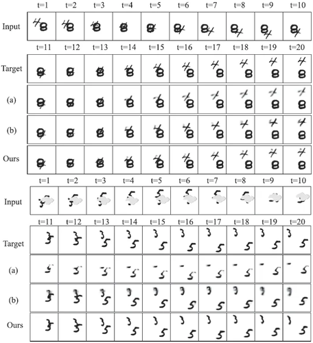 本文拟解决的主要挑战有两个:1)实际应用场景存在镜头被污染、遮挡,目标被其他物体遮挡等情况,造成目标的外观信息部分丢失,影响对目标动作的准确预测;2)遮挡情况下的视频预测模型不仅要对遮挡部分填充,还要对视频的时空特征做预测;可归纳为时空感受野狭窄和遮挡类噪声破坏时空连续性问题。其中,时空感受野狭小是指现有多数工作难以利用相隔较远的视频帧所包含的时空特征,导致难以捕获复杂长期依赖关系。当视频中发生突变时,未来时刻的视频帧应更多地依赖其邻近时刻的视频帧;但当视频场景中的多个运动物体出现频繁的重叠情况,使得运动物体邻近区域图像的像素值分布产生多次突变,要求模型能利用较远时刻重叠发生前的视频帧。此外,现有的基于深度学习的视频预测模型均假设视频是无损表示,未考虑真实场景中遮挡类噪声的影响,其会破坏时间和空间特征的连续性,例如气象雷达发射的电磁波会由于山体的阻挡导致雷达回波图上出现遮挡区域,遮挡区域会对后续预测结果产生很大的干扰。