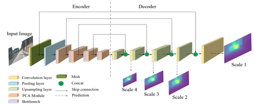 深度估计网络的结构如图2所示,采用编码器-解码器结构,并建立长跳跃连接,使解码器可以融合更多的细节信息。深度网络每次以一帧作为输入,估计四个不同尺度的视差图。将金字塔通道注意力模块PCAModule插入编码器的四个残差块后,网络能够捕获多尺度的空间信息,并赋予更有用的特征更多的关注,提升深度估计性能,恢复出更多的细节信息。