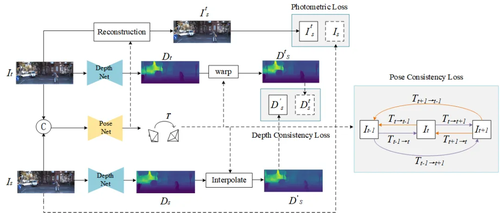 深度估计是三维重建、自动驾驶等领域中关键环节,对于场景理解至关重要。无监督学习的单目深度估计方法具有便于部署、成本低的优点。尺度模糊和病态区域是无监督单目模型中存在的两个问题。尺度模糊问题是由于框架的训练样本是三个相邻的单目帧,缺乏全局约束导致。为了限制不同训练样本间尺度不一致性,本文利用深度信息和位姿信息间的几何一致性原理构建了深度-位姿一致性损失,得到全局一致的尺度。针对由动态物体和遮挡违反光度一致性假设而引起的病态区域,提出了由深度-位姿一致性损失衍生的覆盖掩膜,采用过滤及对异常值分配较低权重策略,减轻病态区域对网络训练的不利影响,提升模型性能。