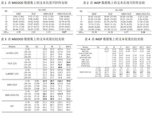 本文使用 MSCOCO和 IM2P两个数据集来评估模型性能。在表1、2中,展示期望长度 (DL) 和平均长度 (AL)、DL 和 AL 之间的差的绝对值 (AD) 以及绝对差的平均值 (ADm),所提方法使用三种所提策略之后实现较高的文本长度可控性,因此可以更好的控制码率。在表3、4中,在不同期望文本长度下,生成的文本质量相比于当前可控文本长度方法好,表明编码得到的文本较为正确。在图3中,展示了不同码率下的重构图像质量结果,并绘制成曲线,实验结果表明VR-CMC 在 MSCOCO 和 IM2P 的所有指标上都优于 CMC、JPEG、JPEG2000,且具有较好的率失真特性。
