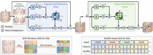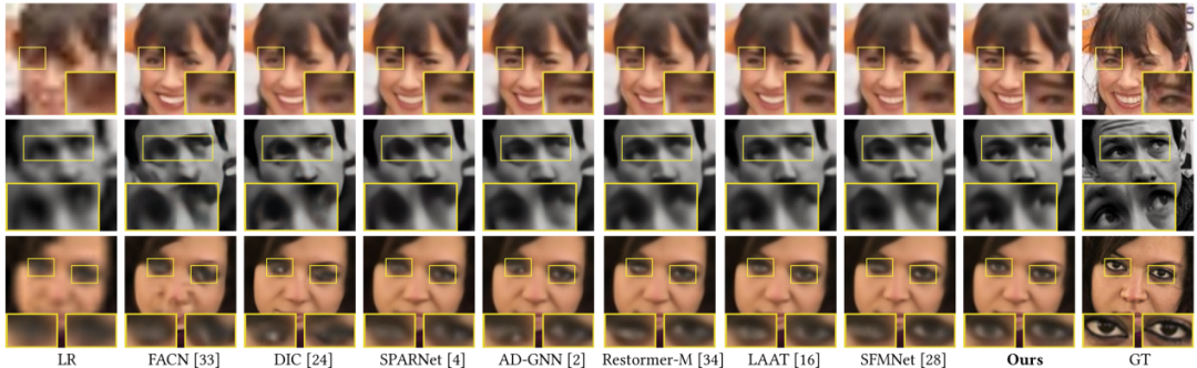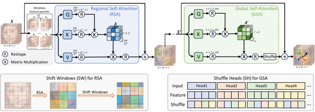为更好地增强小波变换分解后获得的低频面部信息,如下图,我们引入全域Transformer(FDT)。具体而言,由于低频信息包含图像的众多细节特征,提取全面的低频信息至关重要。尽管Transformer在处理低频信息方面表现出有效性,但现有FSR方法中使用的Transformer难以有效聚焦于局部特征(例如皮肤细节)、区域特征(例如眼睛、鼻子等组件)和全局特征(例如整体面部轮廓)。为解决此问题,本文提出FDT,旨在探索多样化的感受野并发掘面部特征间的深层关联,从而提取更全面的人脸信息以提升FSR效果。