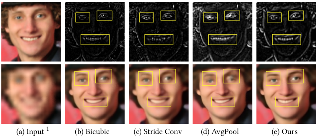 特征图(第一行)与FSR结果(第二行)展示了多种下采样方法的效果:双三次插值、步长卷积、平均池化以及我们的小波特征下采样。(a)和(b)中高频特征的损失尤为明显,而(c)则出现了频域特征混叠现象。我们的方法能有效防止特征损失或频域混叠现象。