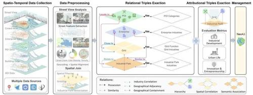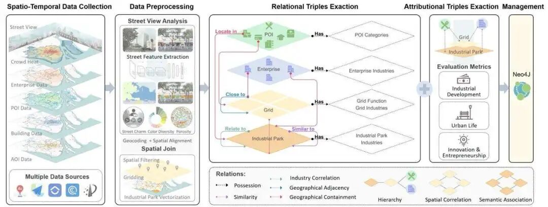 针对上述挑战,我们首先构建并开源了首个大规模、多模态、多层次(空间与语义)的产业园区知识图谱IndustryScopeKG。该知识图谱深度整合了上海市的街景、企业、社会经济和地理空间等多源数据,涵盖了264个产业园区、12.8万个空间网格、105万家企业实体,最终构成了包含超过223万实体和5100万三元组的庞大知识库。IndustryScopeKG不仅通过多维度的属性指标体系(如产业发展、城市生活、创新创业三大维度下的111个具体指标)对园区进行精细刻画,还通过地理空间关系(包含、邻接)和语义关系(相似性、产业关联性)建立了实体间的复杂连接,为后续的知识驱动决策提供了坚实的数据基础。