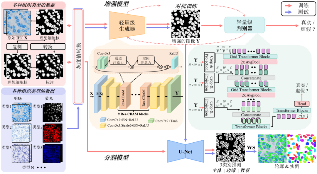 为解决这一难题,本文提出GeNSeg-Net,一种具有高泛化能力的通用框架。该方法采用两阶段设计:首先通过增强模型对细胞核进行生成式“标准化”,将多样的形态特征转化为理想的、边界清晰且质地均匀的核结构;随后使用经典的分割模型(如U-Net结合分水岭算法)完成精确分割。这种“先增强、再分割”的策略,有效降低了因组织和成像差异带来的挑战,使分割模型在面对未见过的组织类型时仍能保持较高准确度。