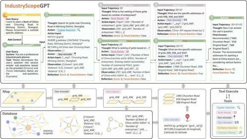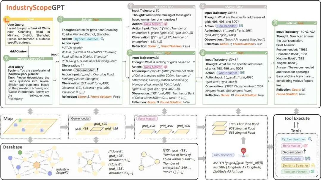 在此基础上,我们进一步提出了IndustryScopeGPT框架,一个创新的LLM驱动智能体框架,旨在增强LLM在产业园区规划与运营任务中的工具增强推理和决策能力。该框架将LLM作为核心控制器,通过设计一系列专用工具(如Cypher查询器、地理编码/解码器、排序器、功能规划器等)与外部的Neo4j图数据库进行动态交互,实现了LLM与空间计算和动态图谱推理的首次融合。为了解决LLM在复杂决策中可能出现的推理路径不佳或工具使用错误等问题,IndustryScopeGPT创新性地引入了蒙特卡洛树搜索(MCTS)机制。MCTS将复杂的规划决策过程视为一个树搜索问题,通过选择、扩展、模拟和回溯四个步骤,动态平衡探索与利用,从而在巨大的规划空间中寻找最优的决策路径,显著提升了任务执行的灵活性、鲁棒性和可解释性。